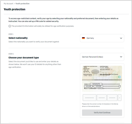 You can access the age verification page via the restricted content or via the "Youth Protection" section in 'My Account', where you can choose from various nationalities and ID documents for age verification (scroll all the way down to see all available nationalities and ID documents).