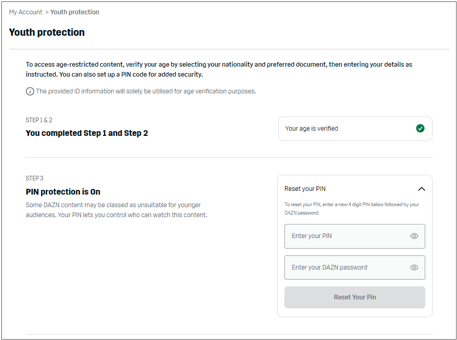 To set a new PIN, enter the new PIN together with your DAZN password and click on ‘Reset your PIN’: