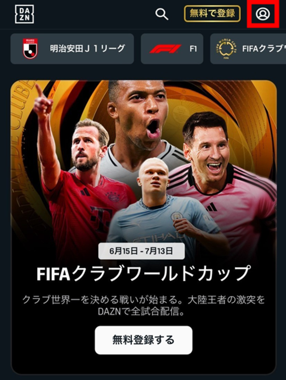 1.DAZNのアプリを開き、画面右上の人型のアイコンをタップします。